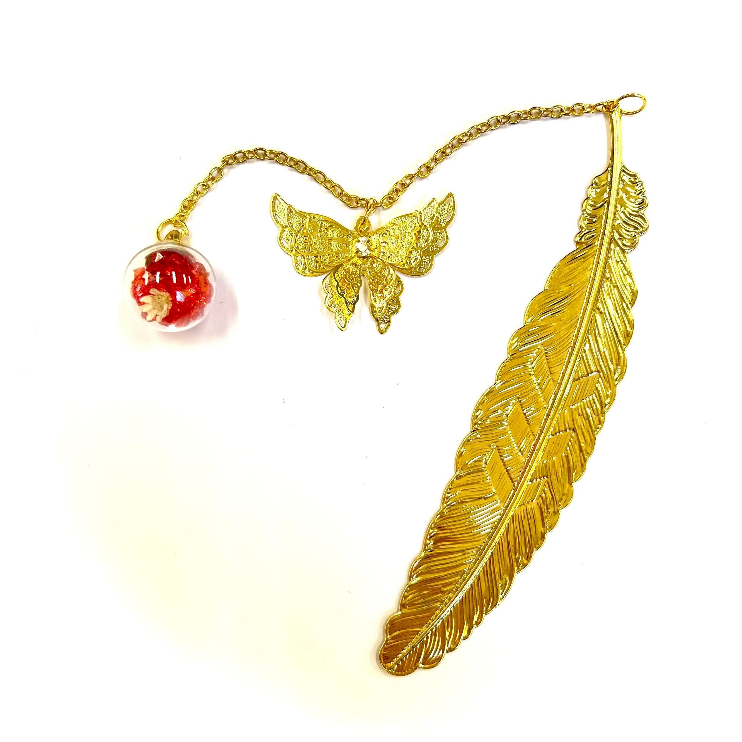 美しい蝶々・葉脈の金細工と風鈴モチーフの綺麗なガラス玉が施されたこの栞は、読書や美術展示、テキストノートにピッタリのアイテムです。