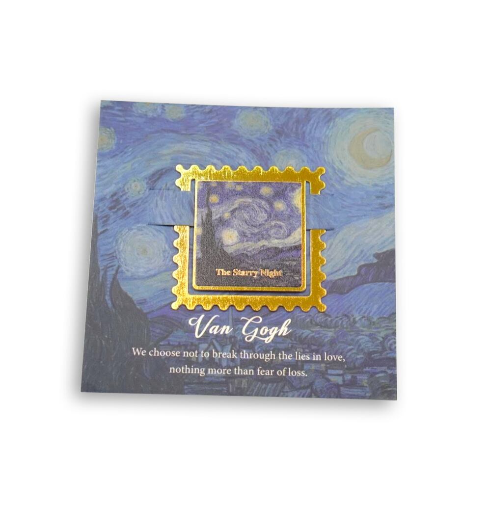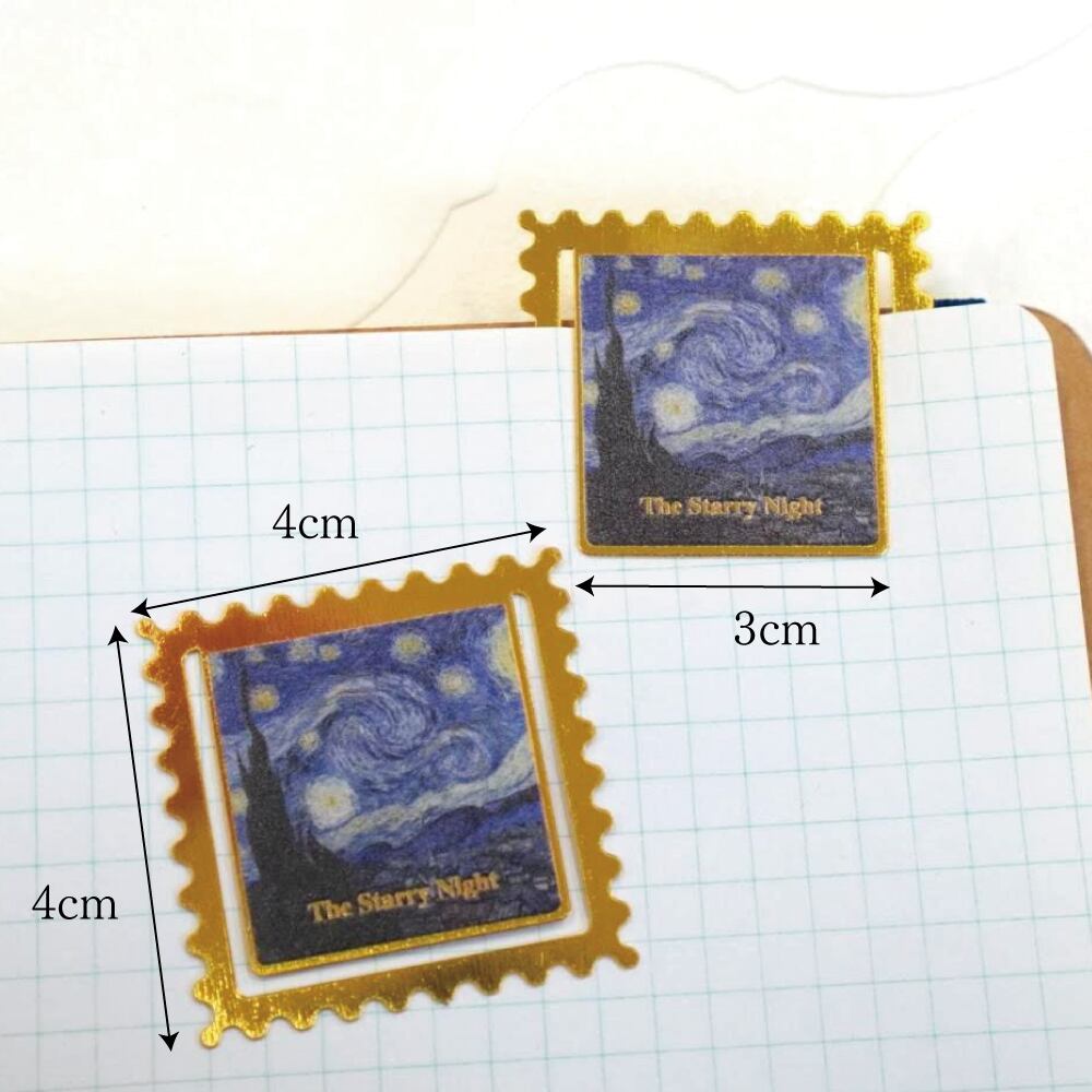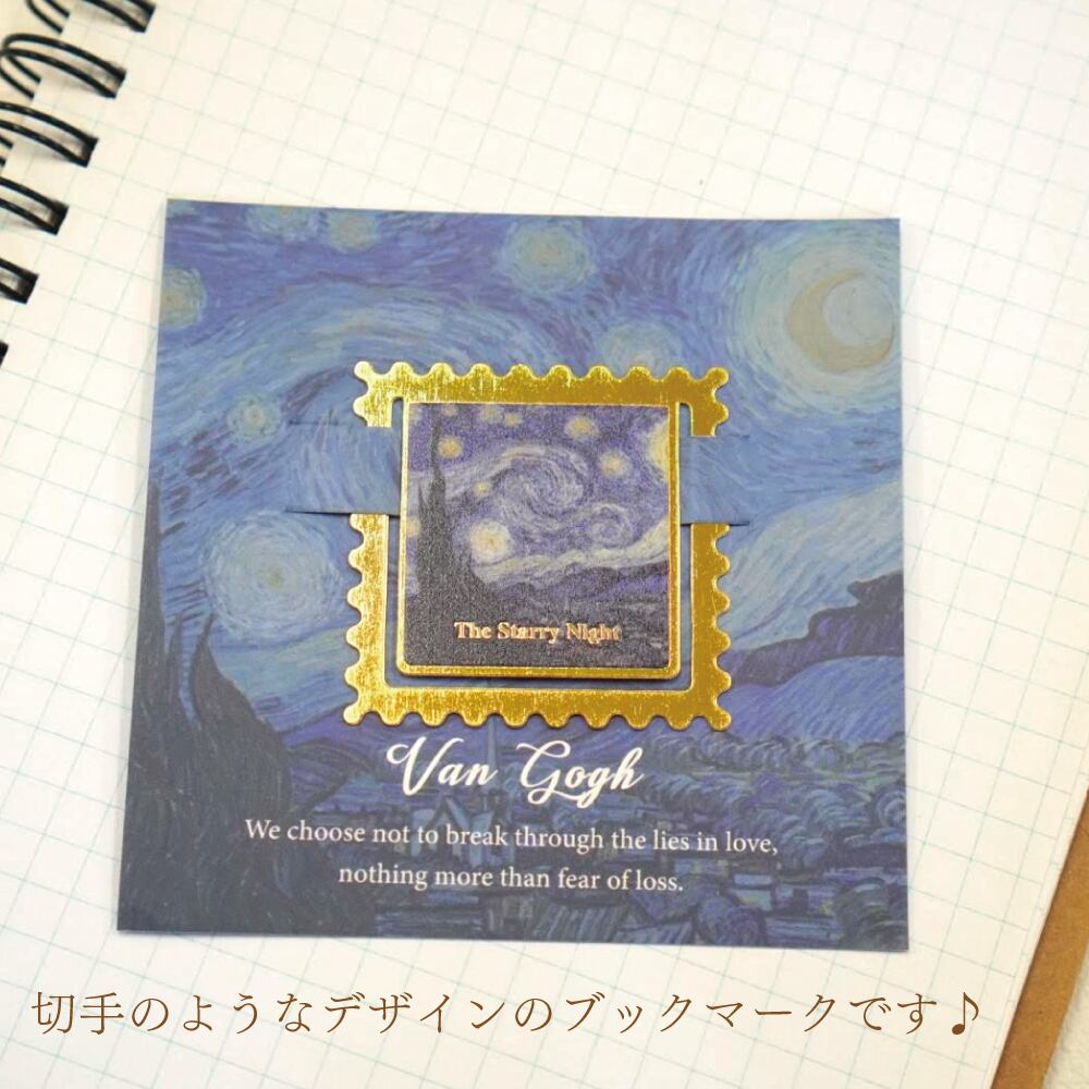 ポスト印象派を代表する画家、フィンセント・ファン・ゴッホの代表作「星月夜」をモチーフにした、ゴールドのフレームが美しい切手型ブックマークです。