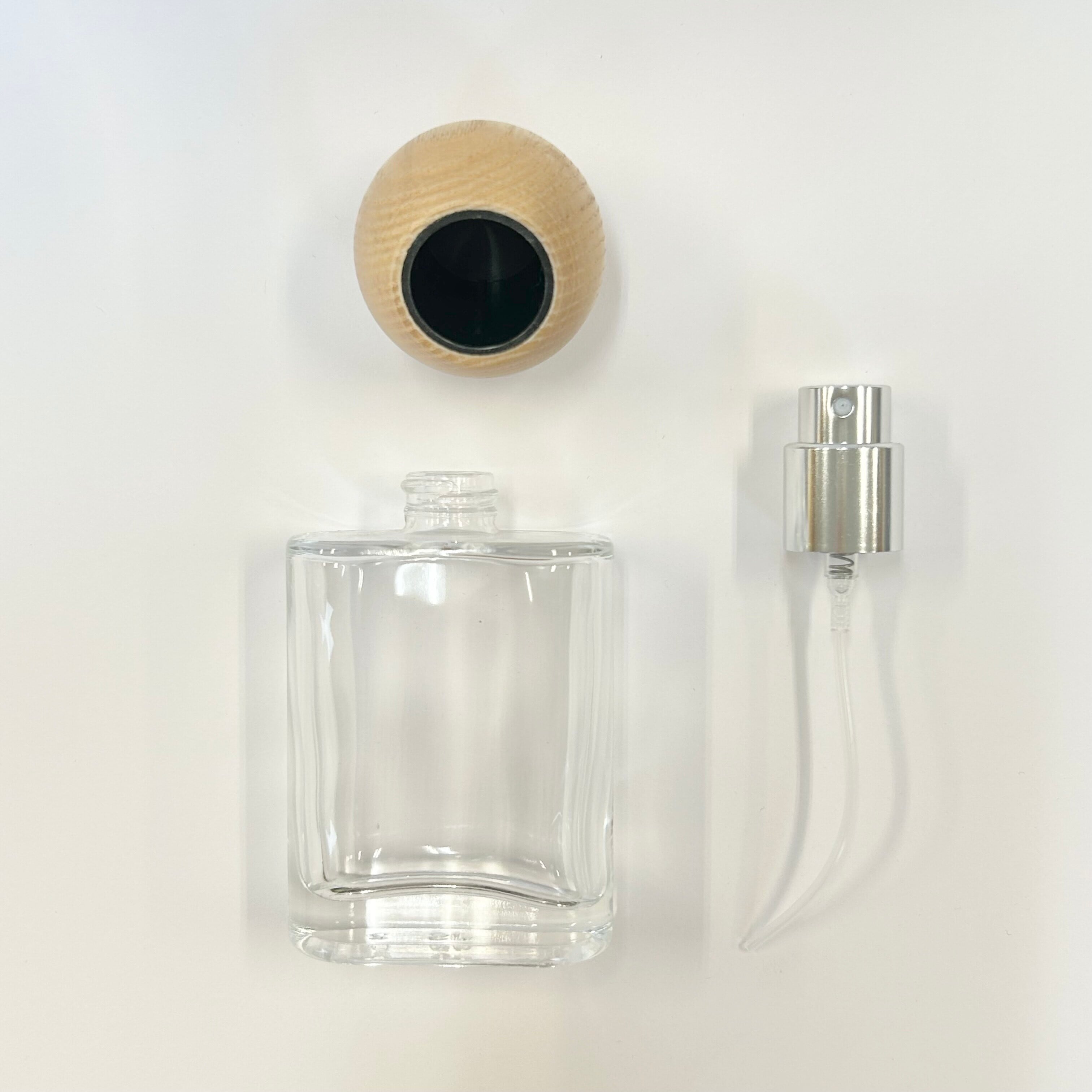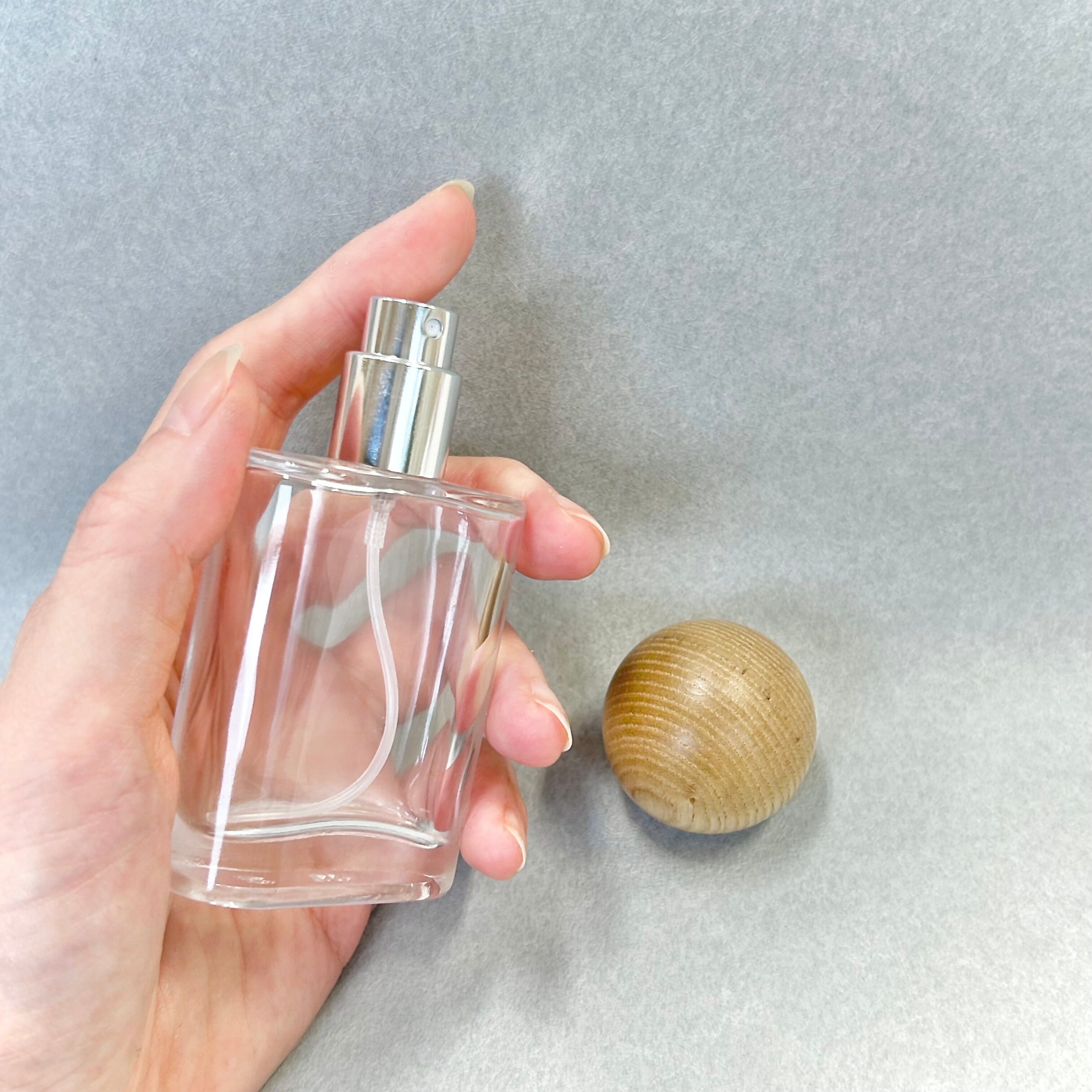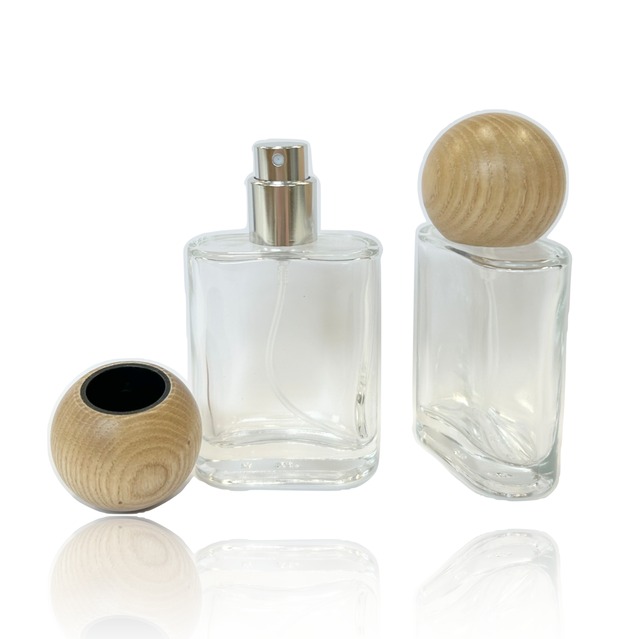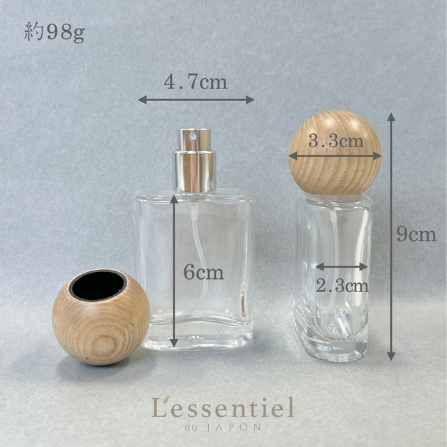 ナチュラルなオーク素材の木目が美しい、30mlのクリアガラススプレーボトルが登場です。