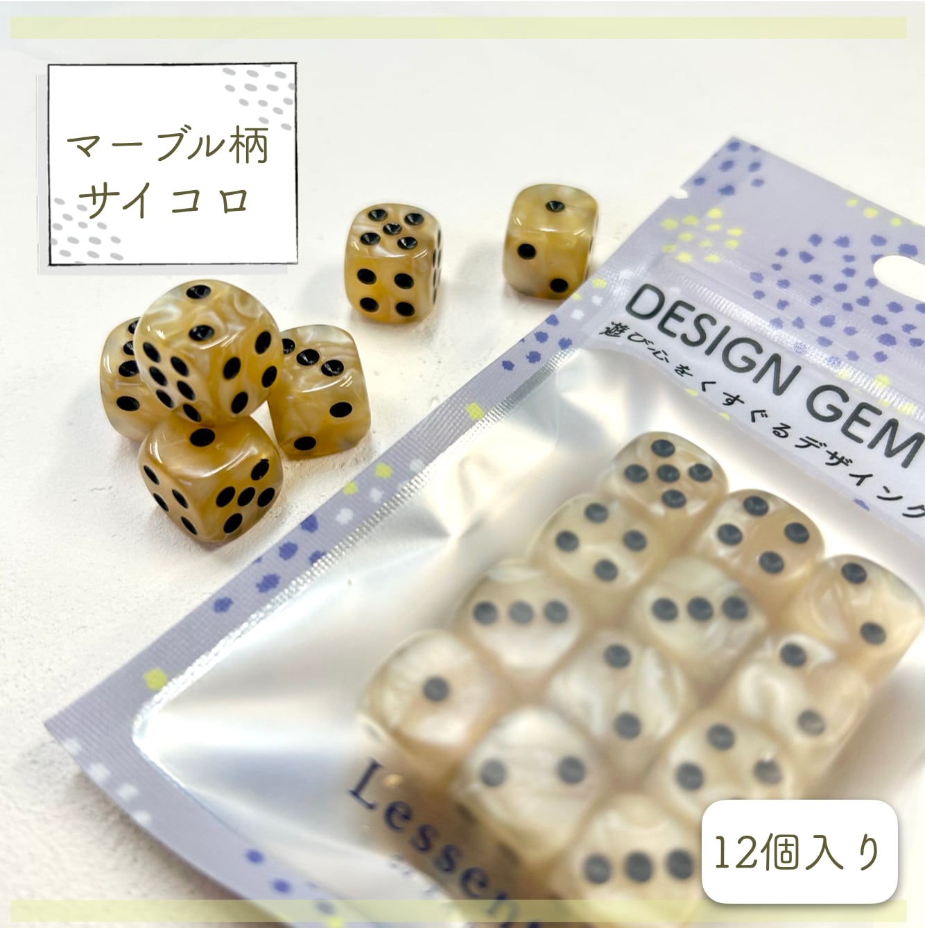 ユニークなマーブル柄が目を引く、お洒落なデザインのサイコロ12個セットです。