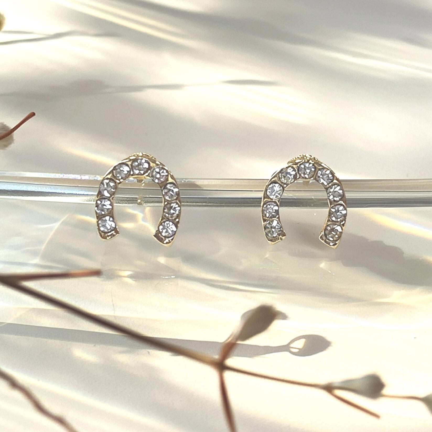 【 ホースシュー ゴールド ピアス 】 馬蹄 モチーフ U字 お守り ラインストーン 両耳用 アクセサリー ジュエリー ファッション 小物 プレゼント ギフト ご褒美 自分用 普段着 普段使い 通学用 通勤用 旅行 パーティー イベント デート ディナー