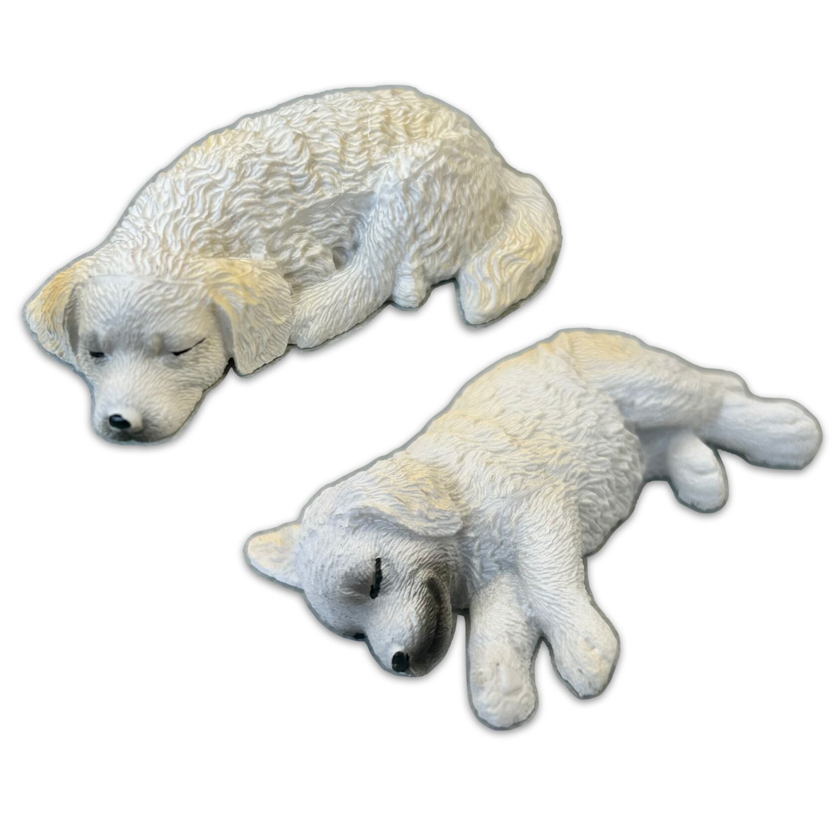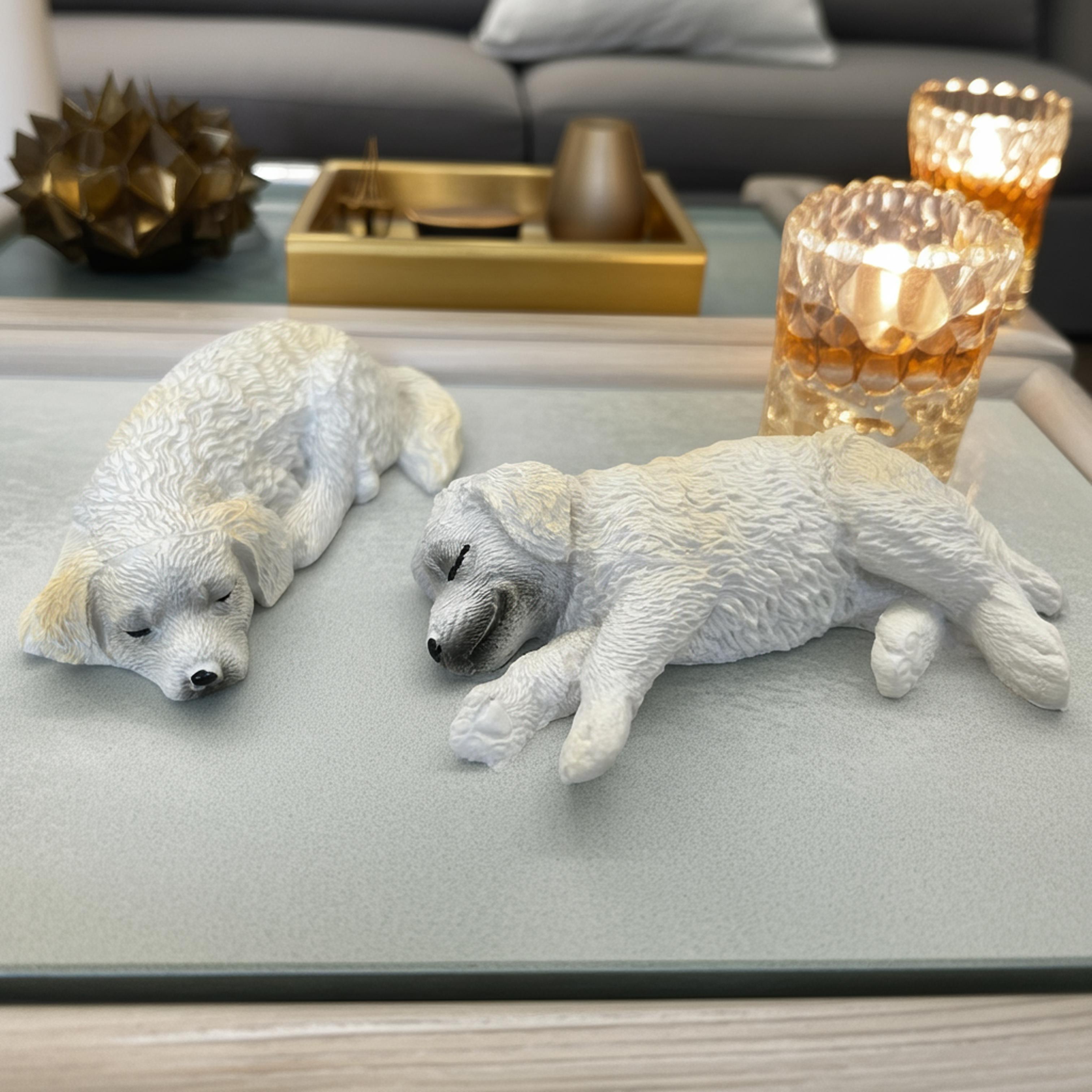 まるで本当に眠っているかのような、立体的でリアルなデザインが特徴の愛らしい犬の置物です。
