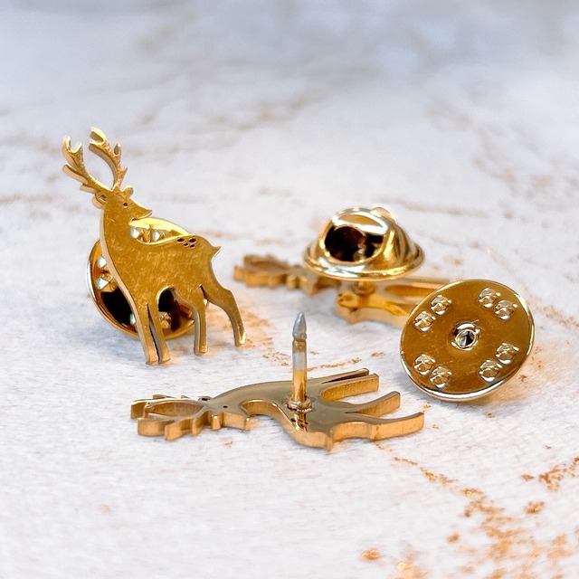 煌びやかなゴールドが目を引く、躍動感のある鹿をモチーフにした素敵なピンバッジです。