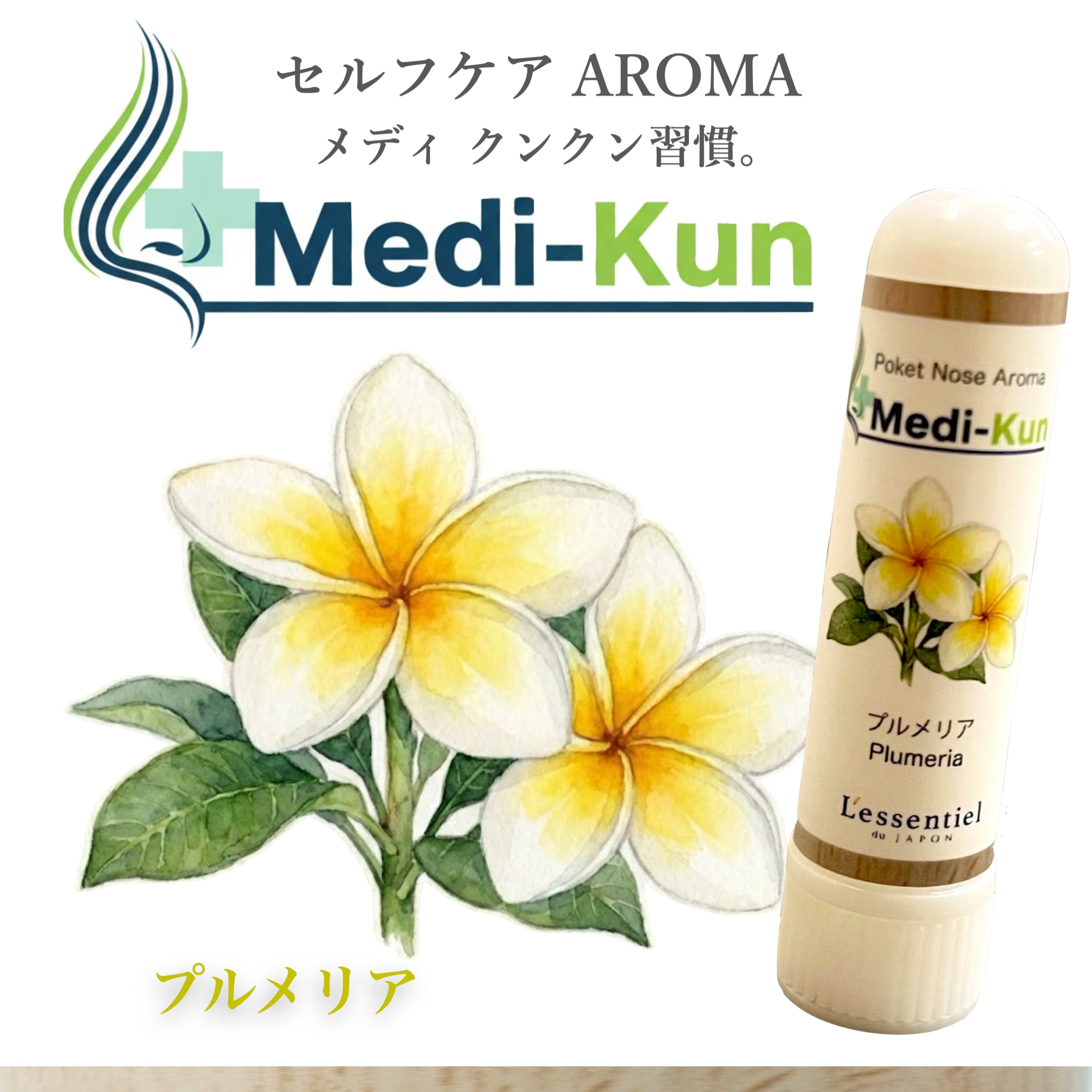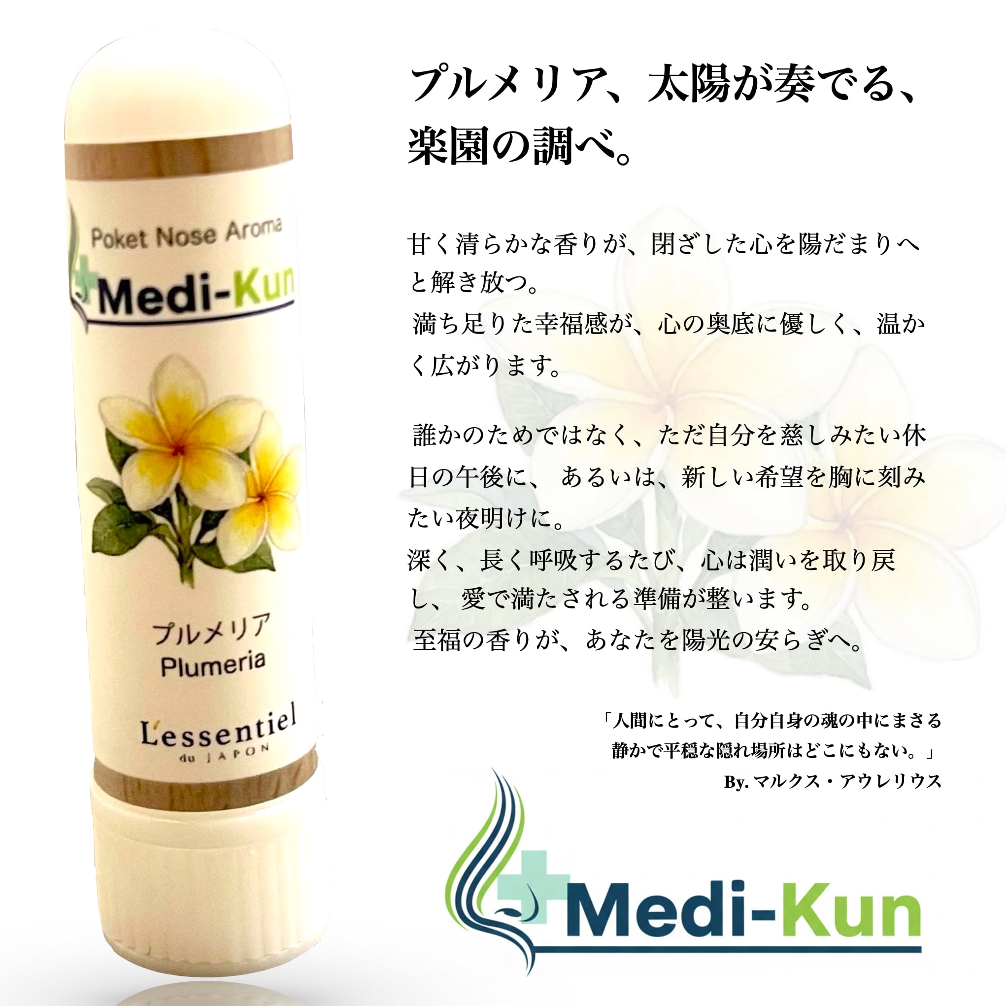 「メディクン プルメリア」は、沖縄やハワイの代名詞であるプルメリアの本物の花の香りです。日常の気持ちを和らげるためのセルフケアとしておすすめのアイテムです。