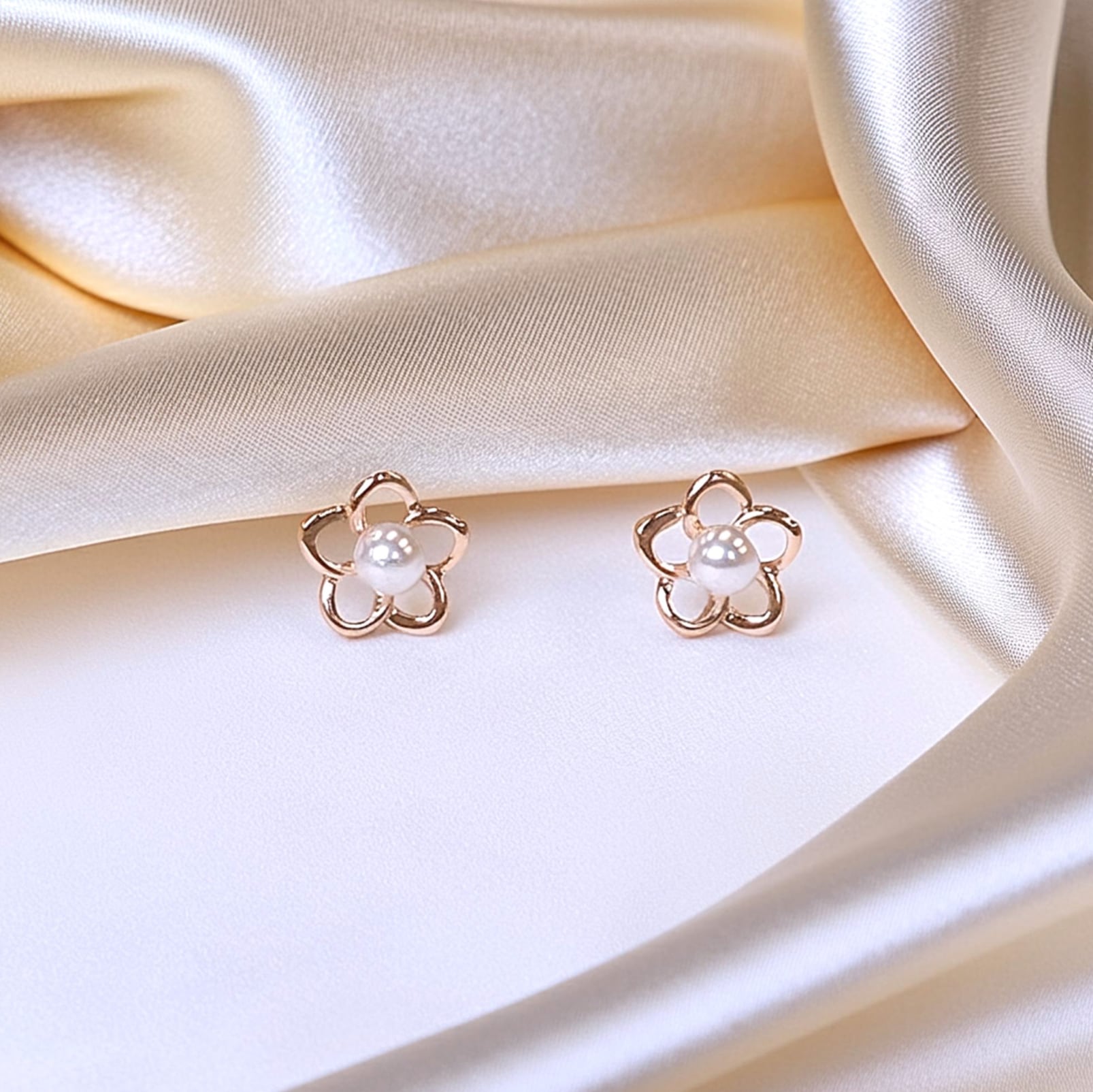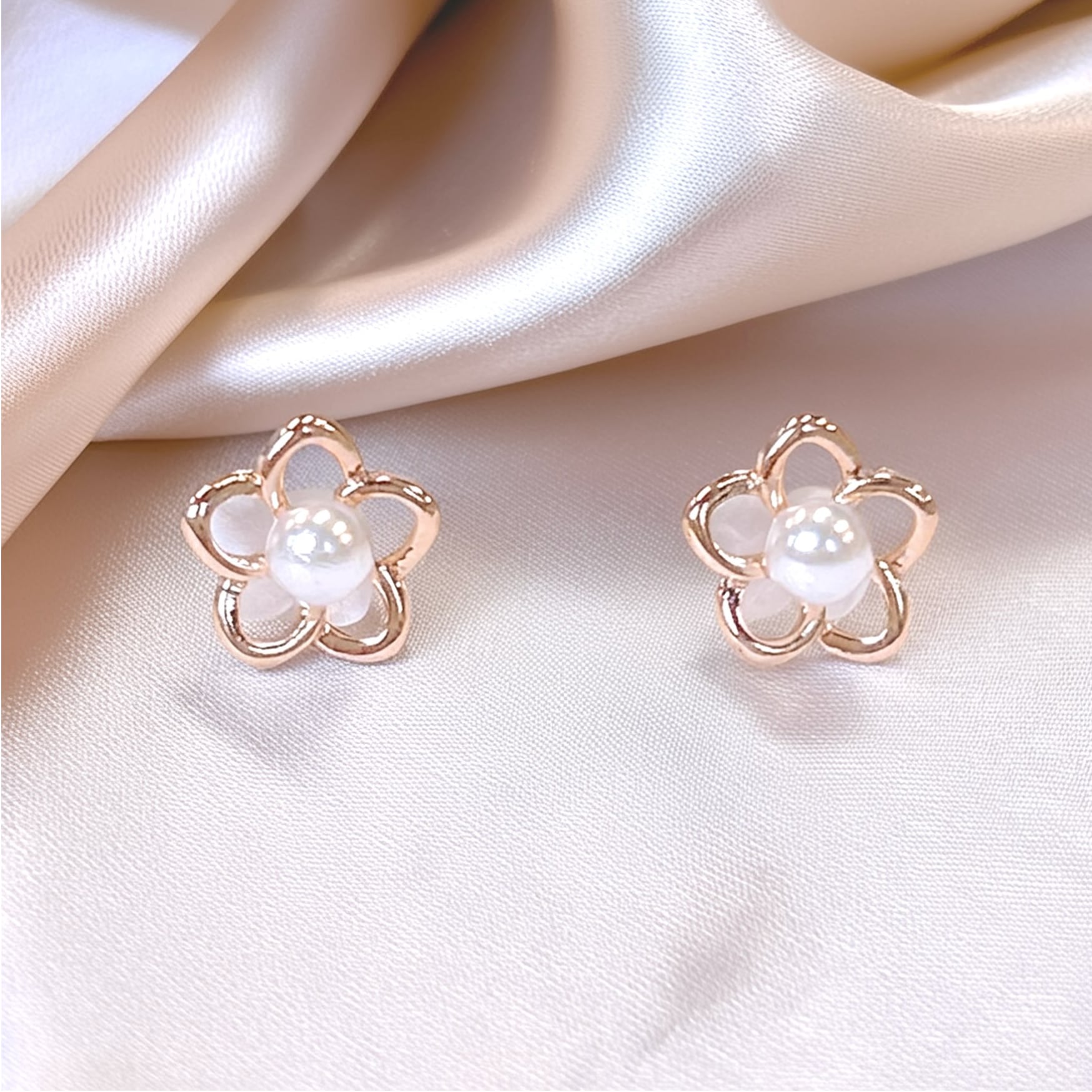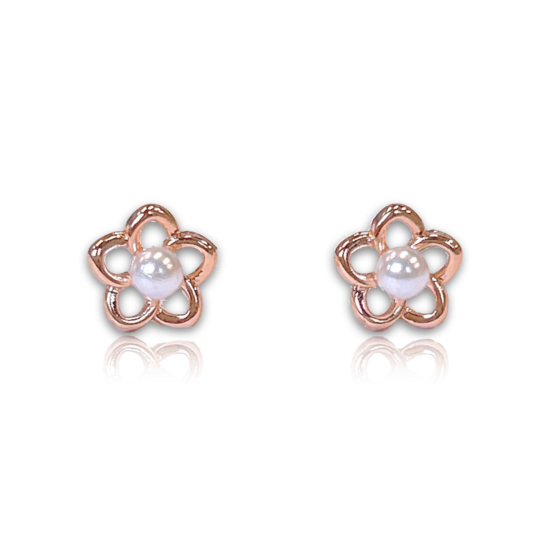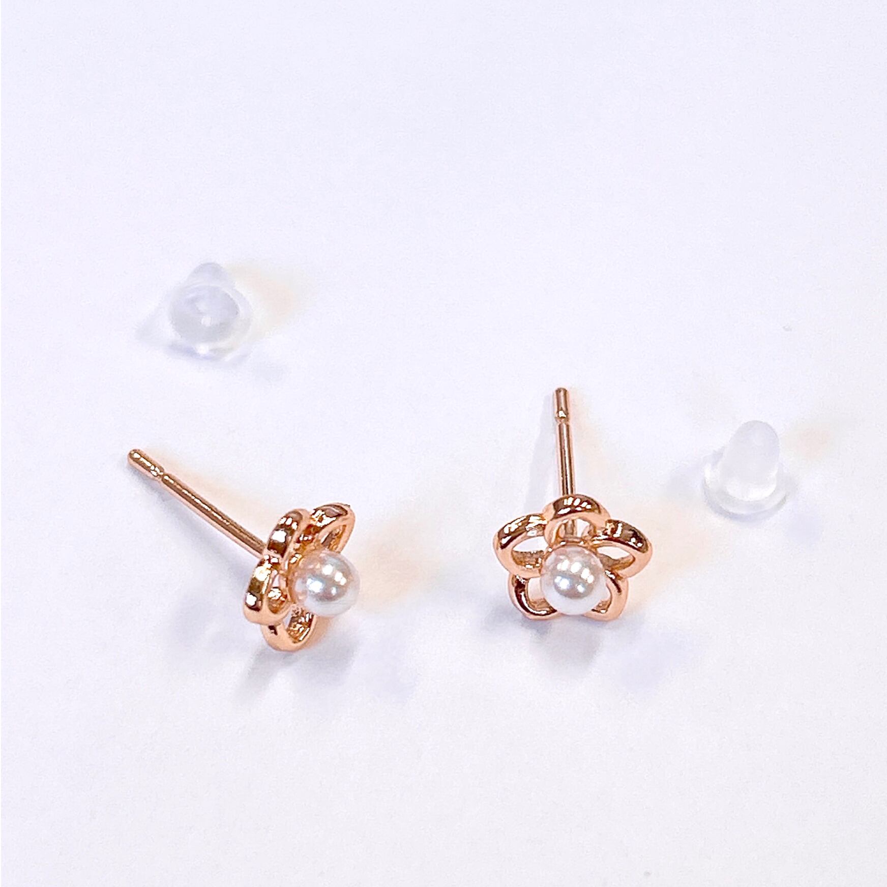 ピンクゴールドが美しい、花とパールをモチーフにした華奢で小ぶりなピアスです