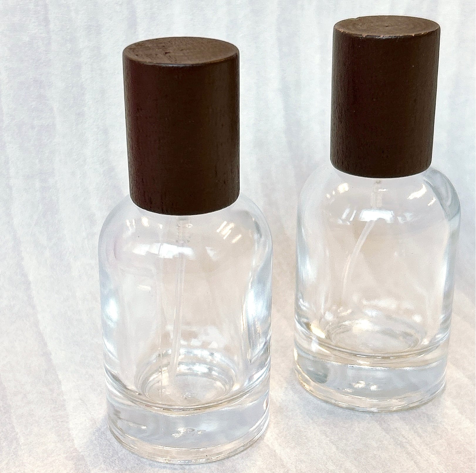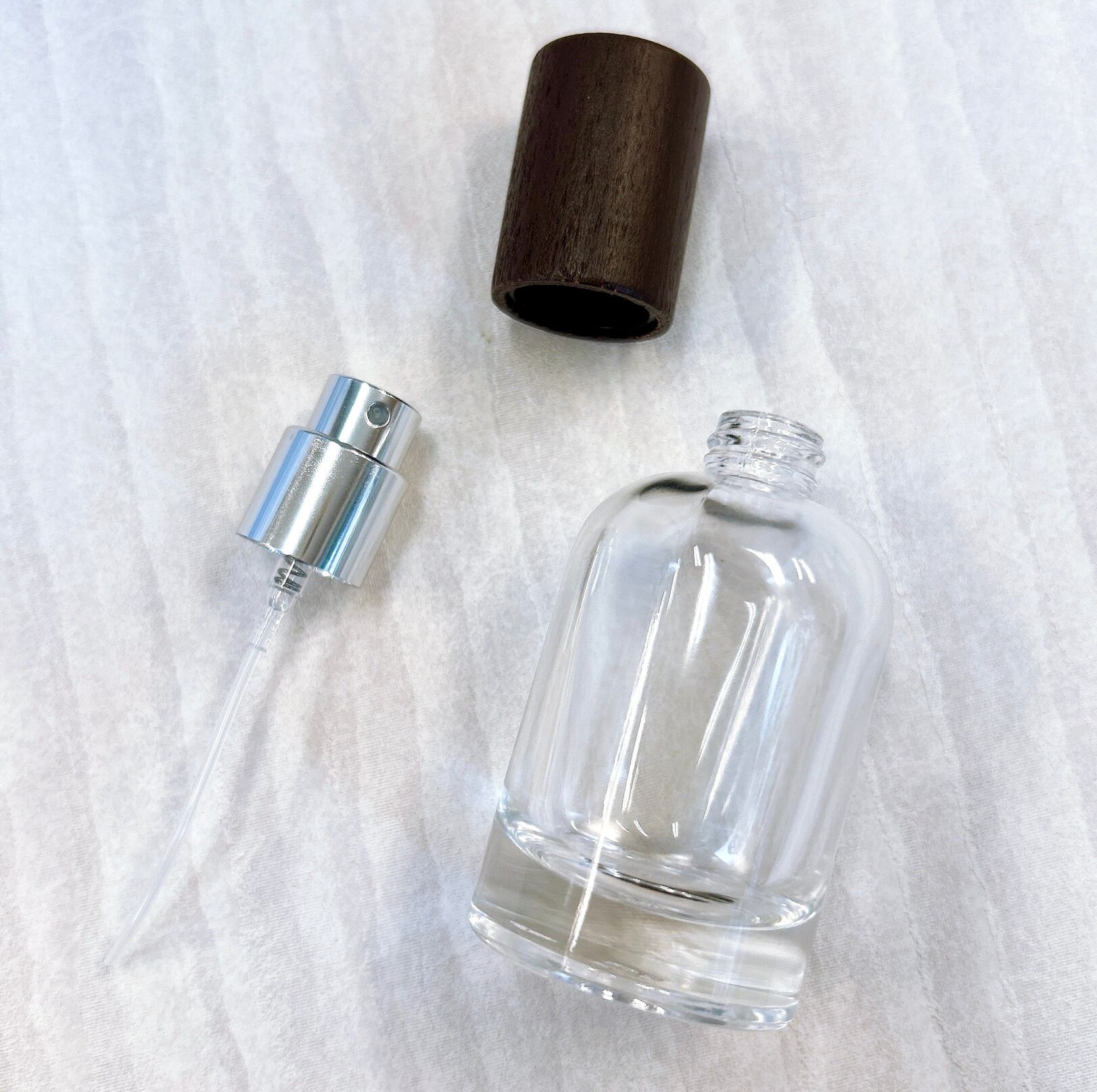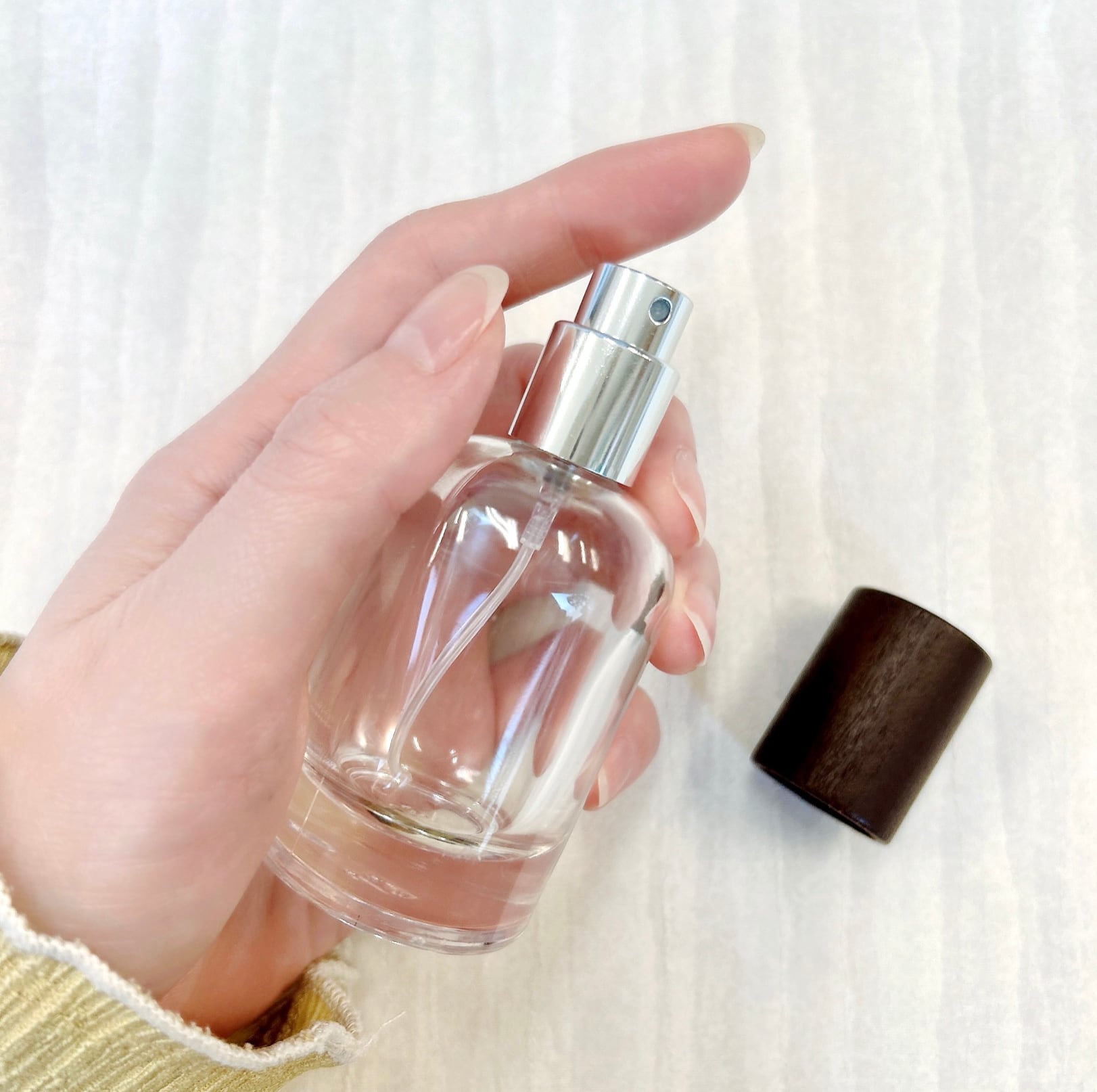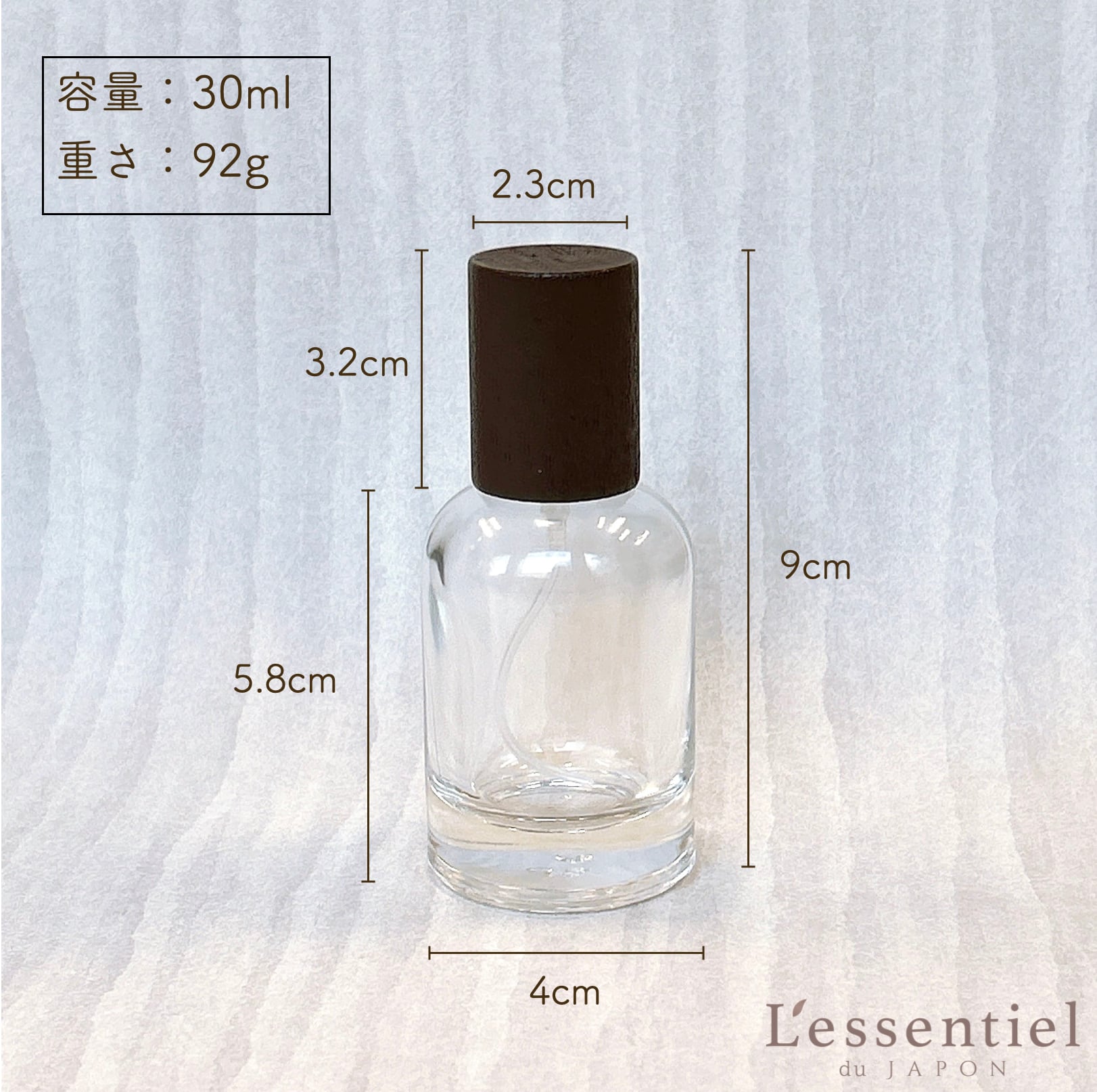 美しい木目調のデザインが特徴的な、30mLのガラス製スプレーボトルです。