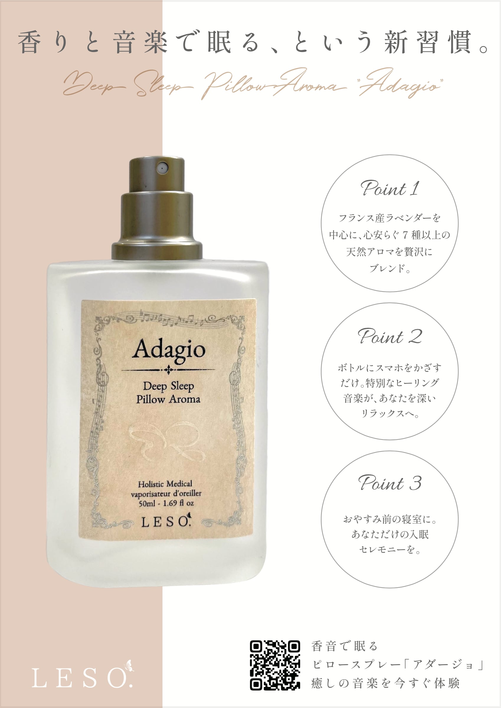 ピロースプレー「Adagio」は、リラックス効果の高い睡眠セラピスト監修アロマをバランスよく配合しており、心を落ち着かせる香りが、あなたを優しく包み込みます。