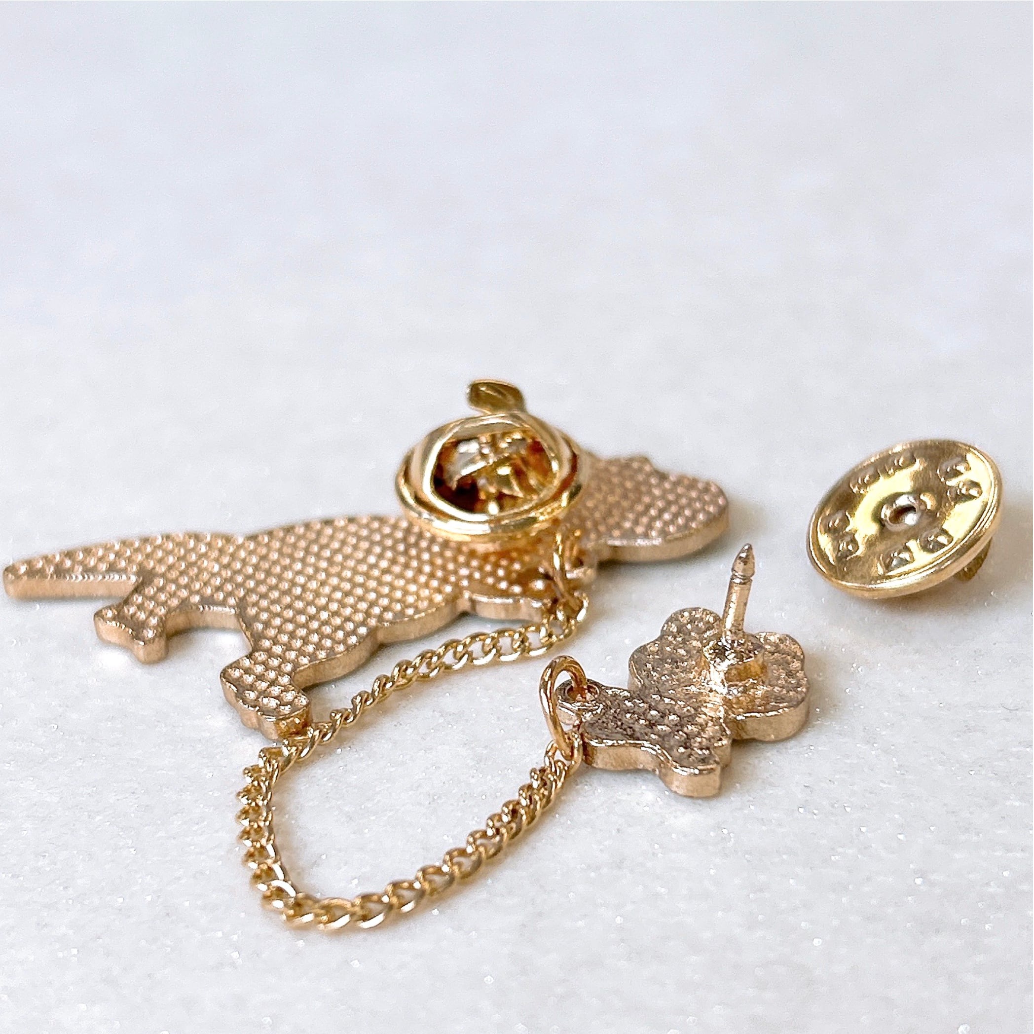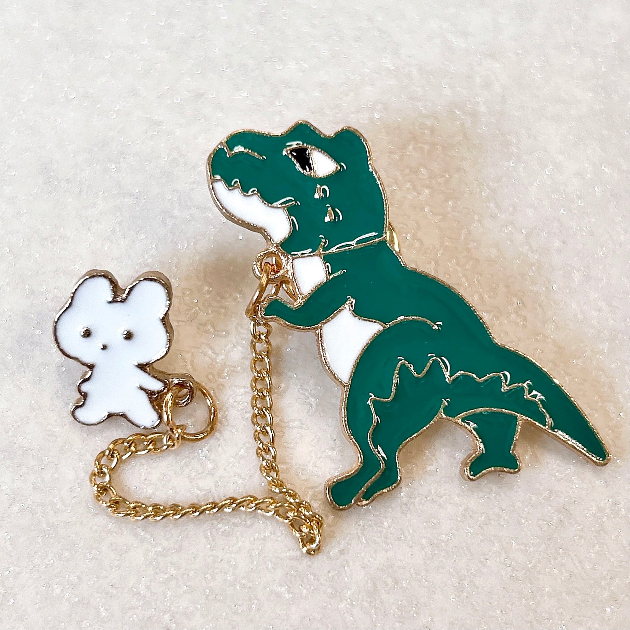 【 うさぎ と 恐竜 の お散歩 ピンバッジ 】チェーン付き ゴールド チェーンピンバッジ 揺れる ウサギ 兎 ティラノサウルス 散歩 仲良し 友達 ペット イベント ピンブローチ 胸飾り 装飾ピン アクセサリー ファッション 小物 ワンポイント レディース ギフト プレゼント おしゃれ 雑貨 アクセント かわいい 可愛い