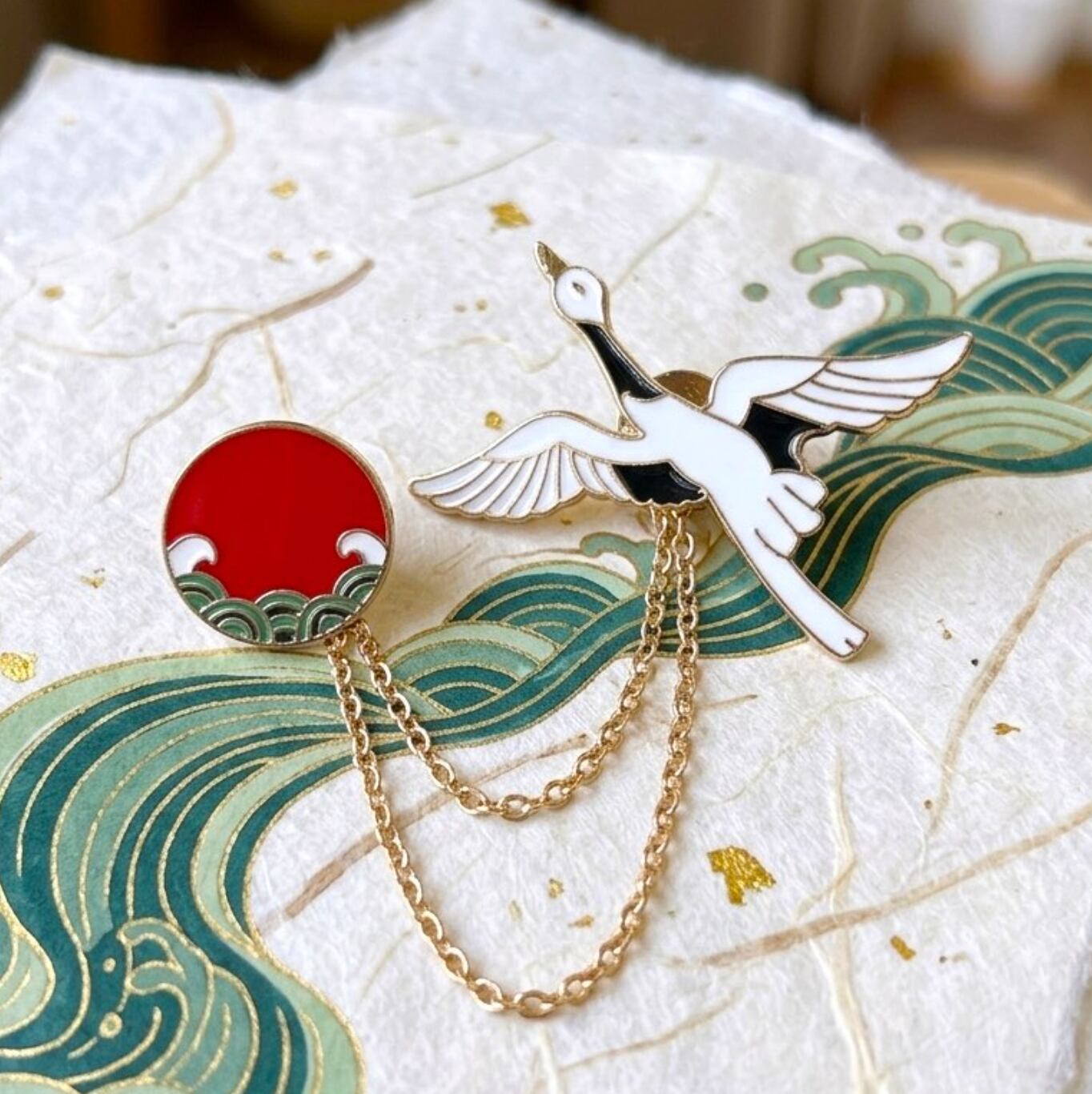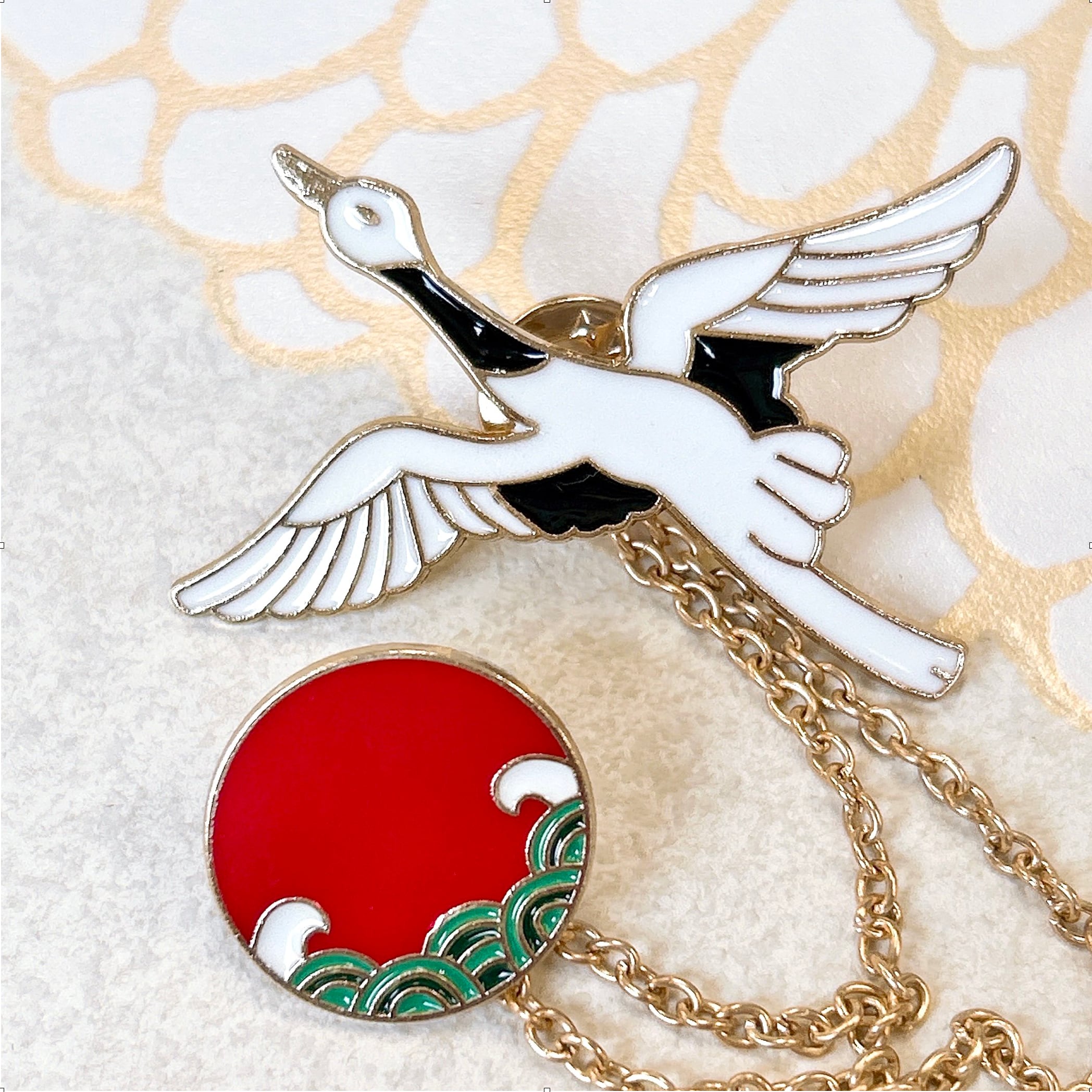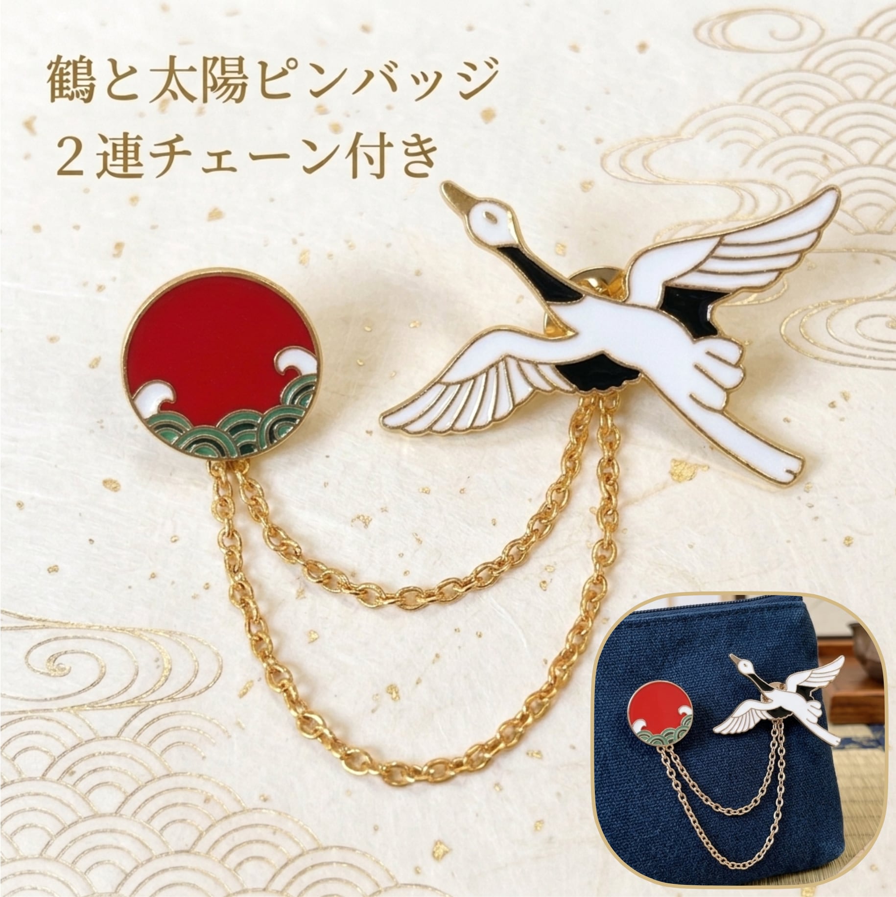 【 鶴 と 太陽 ピンバッジ 】2連 チェーン付き ゴールド 取り外し可能 チェーンピンバッジ 揺れる 青海波 鳥 野鳥 波 海 日の丸 日本 JAPAN ジャパン 縁起 高級 和 和風 イベント ピンブローチ 胸飾り 装飾ピン アクセサリー ファッション 小物 ワンポイント レディース ギフト プレゼント おしゃれ 雑貨 アクセント おしゃれ かわいい 可愛い