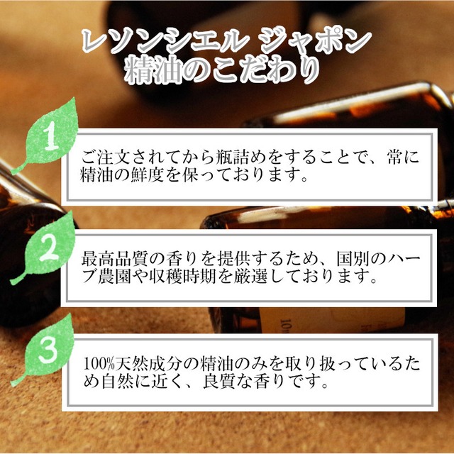 オレンジスイート、サイプレス、レモン、スペアミント、ユーカリ、ローズマリー、カモミールローマン、ペティグレン、マージョラム、真正ラベンダー、イランイラン、ネロリ、サンダルウッド、パチュリ