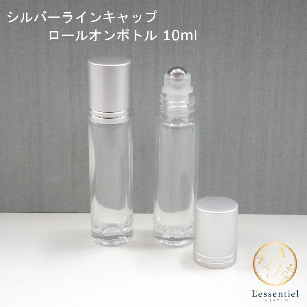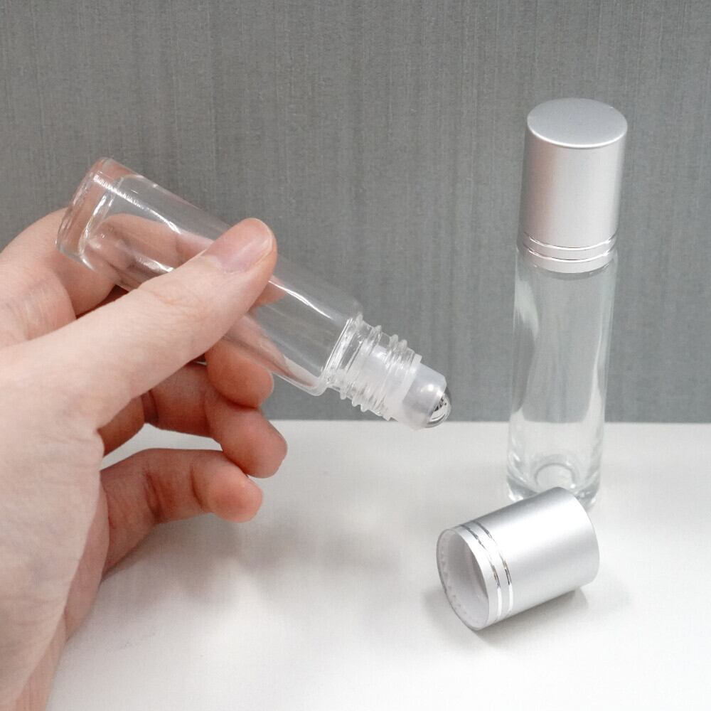 【ロールオンボトル】10ml シルバーキャップ ライン 透明 ガラス製 細身 携帯 化粧 アロマ 器材 遮光 旅行 詰替 容器