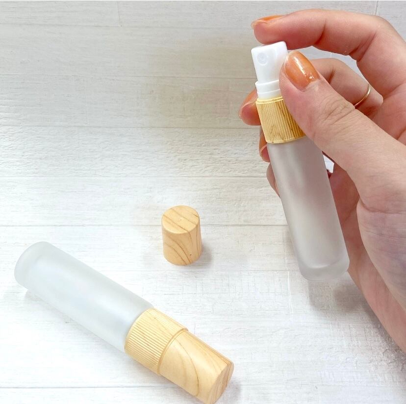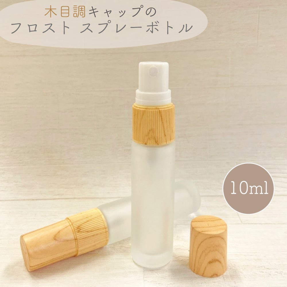 【木目調キャップ スプレーボトル】10ml 1本 ガラス フロスト加工 美容 香水 アロマ 遮光瓶 ボトル 精油 エッセンシャルオイル 霧吹き 携帯 旅行 持ち運び ミスト 手指消毒 コスメ 化粧水 ナチュラル 北欧 木製 詰替容器 詰め替え