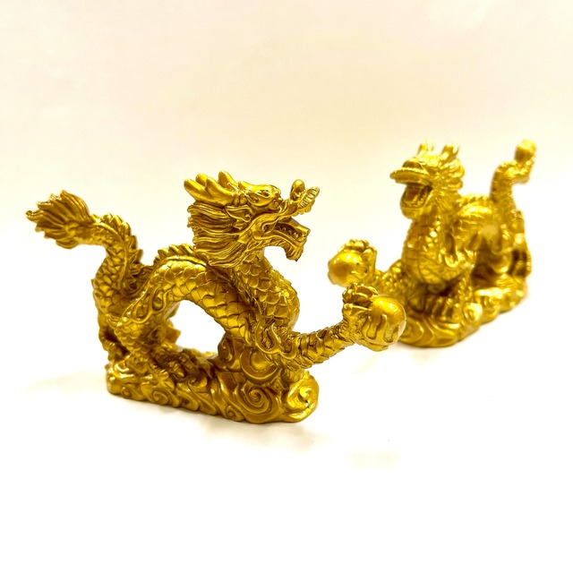手の上に乗るサイズの黄金色に輝く 龍(辰)のオブジェ。