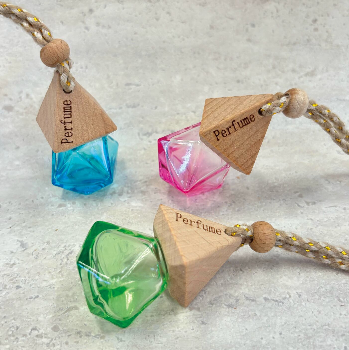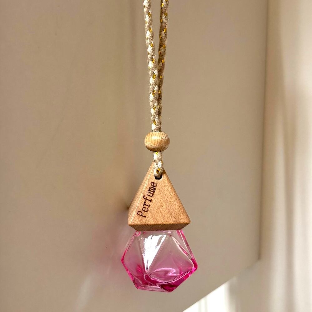【 吊り下げ ディフューザー 《ピンク》 】 ダイヤモンド ウッド ミニ 小型 詰替 ボトル 5ml 木製キャップ ミサンガ 車 玄関 トイレ カーフレグランス 精油 香水 アロマ エッセンシャルオイル おしゃれ 可愛い 北欧 ナチュラル