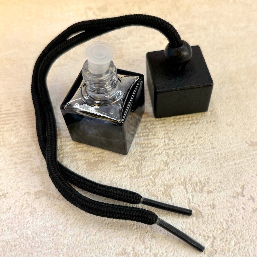【吊り下げ ミニ キューブ ディフューザー】 8ml スクエア ブラック グラデーション 吊るし型 ガラス デスク ボトル ウッド 木製キャップ 車 カーフレグランス アロマ リフレッシュ 玄関 トイレ 寝室 小型 大人 モノトーン シック 精油 エッセンシャルオイル 香水 消臭 ニオイ対策 車酔い 芳香剤 消臭剤