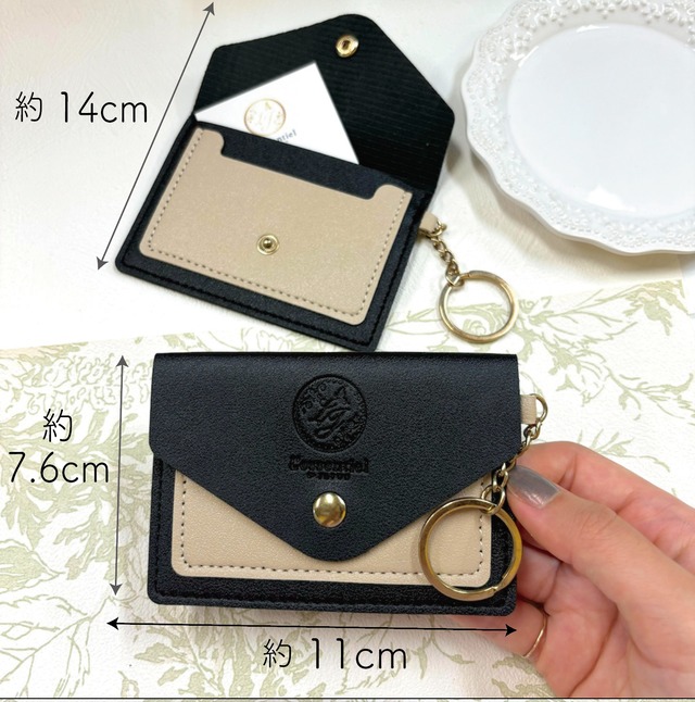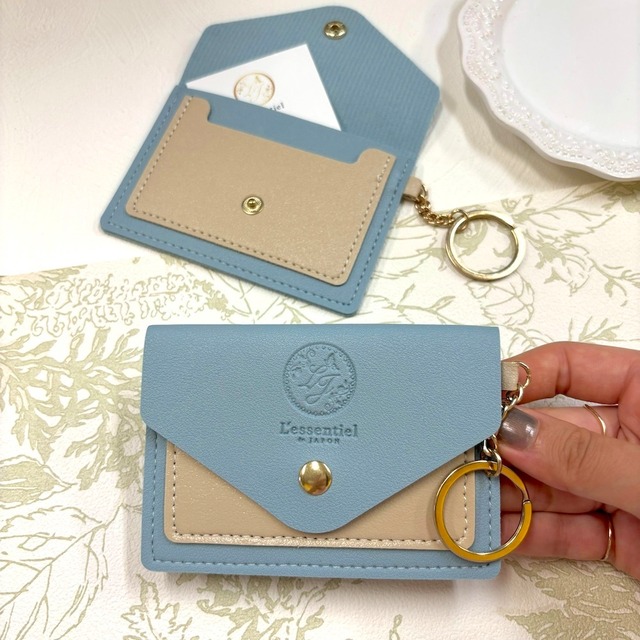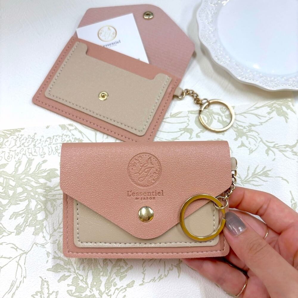 【 レソポン レザー調 バイカラー カードケース 】 選べる3色 1個 キーチェーン付き キーケース パスケース エンボス加工 ロゴ入り スリム パステルカラー 名刺入れ 定期券 鍵 通勤 通学 バッグ コンパクト ベージュ ブルー ピンク ブラック 大人カラー レディース スマート 収納 ショップカード 大容量 合皮